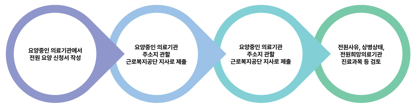 일반적으로 전원은 산재근로자의 신청에 대하여 공단이 전원 사유 등을 확인하여 승인 여부를 결정하고 있으므로, 응급수술 등 긴급한 경우를 제외하고는 반드시 사전승인을 받아야 합니다. 또한 신청을 하더라도 전원 사유에 해당하지 않는 경우에는 전원이 승인되지 아니할 수 있습니다.
