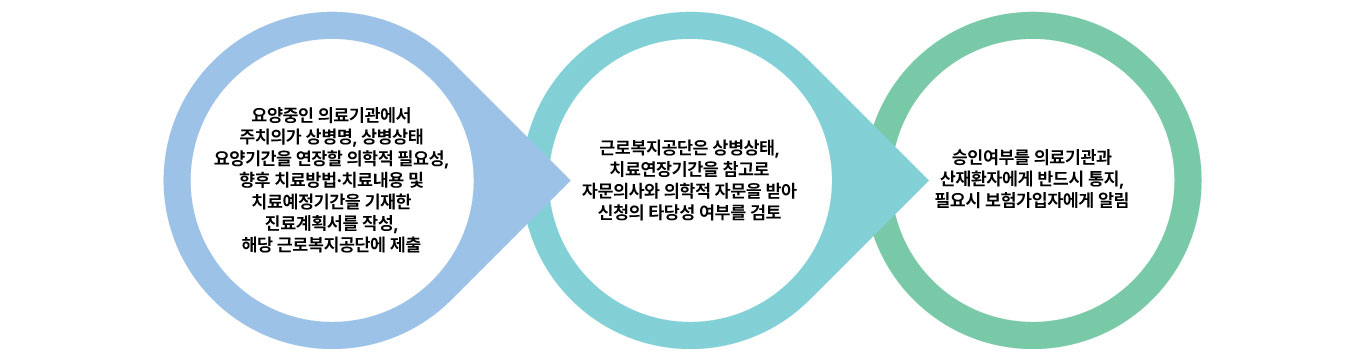 치료 기간을 연장하고자 하는 경우에는 요양을 담당한 산재보험의료기관(주치의)으로 하여금 진료계획서를 제출하도록 하고, 공단은 진료계획의 적정 여부를 심사하여 치료 기간 등의 변경을 명하는 등의 조치를 할 수 있습니다.