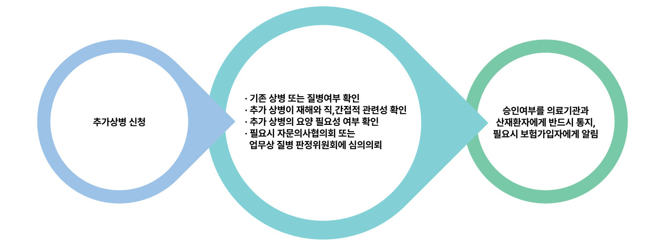 의료기관에서 누락된 상병 또는 치료 중 새로운 상병이 발견될 경우, 추가 상병 신청서에 추가 상병 소견서를 첨부하여 요양 중인 의료기관 관할 근로복지공단 해당 지사 보상부에 제출합니다.